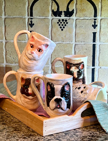 Slab, hand built cups are a delight and inspired by your four footed friends. The 14oz. cups are food and microwave safe.